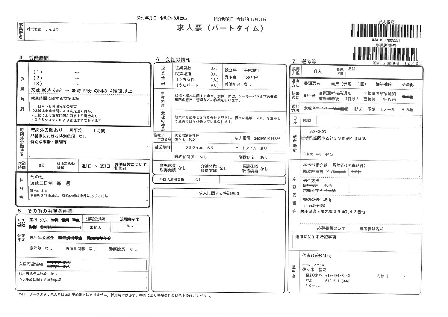 ハローワークを通して事前連絡の上、応募書類(履歴書・紹介状)を事業所所在地まで、提出してください。